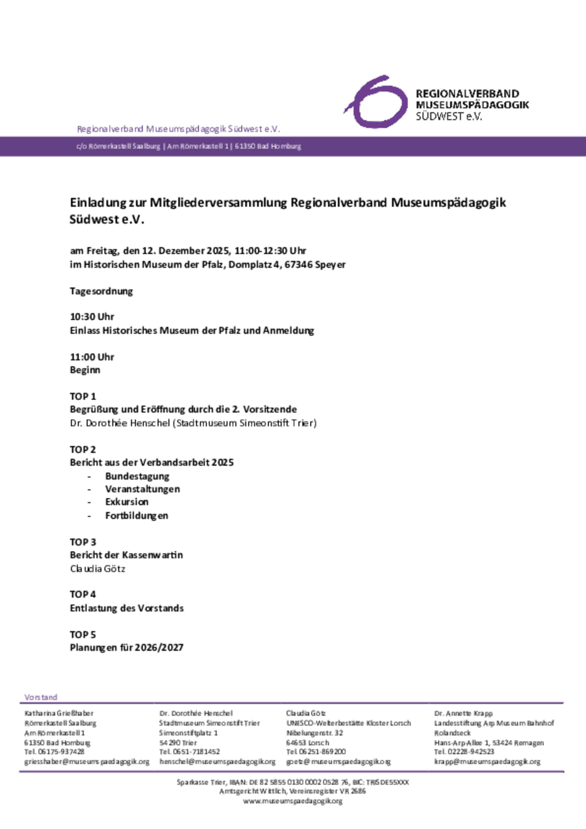 Einladung zur Mitgliederversammlung 2025 im Historischen Museum der Pfalz Speyer