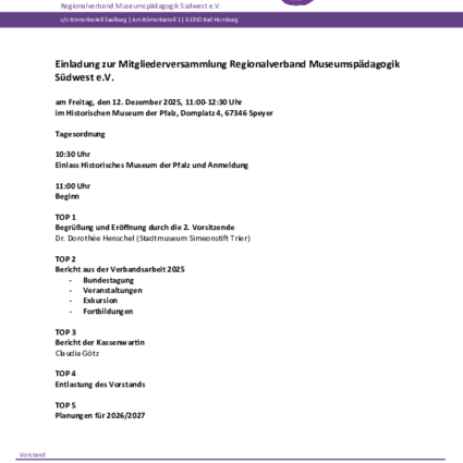 Am 12. Dezember 2025 findet die Mitgliederversammlung des Regionalverbands Museumspädagogik Südwest e.V. in Speyer statt.