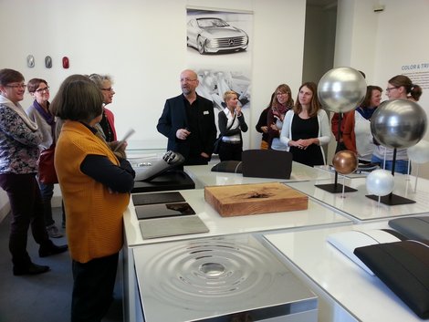 Nach der Einführung führt Otto Pannewitz durch die aktuelle Ausstellung „Daimler Design – Unexpected Moments“, bei der die TeilnehmerInnen nicht verwirklichte Automodelle sowie Zukunftsvisionen des Automobilbaus kennenlernen: Advanced Design, Bionic Cars u.a. nach Vorbild des Kofferfisches, Intelligent Aerodynamic Automobile (IAA). Der Trend, so Pannewitz, gehe derzeit zum selbstfahrenden Auto. Ziel sei die sinnvolle Nutzung der Zeit, die man im Auto verbringt sowie die Reduzierung der häufigsten Unfallursache, menschliches Versagen. Bei der Verwirklichung der Modelle geht es für alle überraschend noch klassisch zu: zuerst kommt die Zeichnung, dann der Bau eines Ton-Modell bevor das Modell digital weiterentwickelt wird.