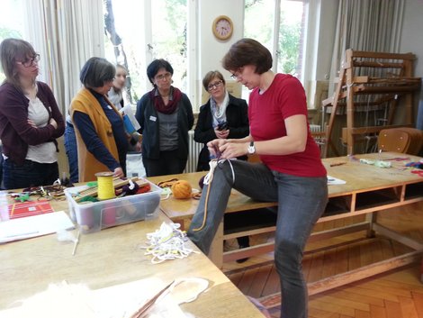 Am Nachmittag durchliefen die TeilnehmerInnen drei museumspädagogische Stationen: Sie betätigten sich künstlerisch an einer kids@kita-Station zum Thema Wasser, unternahmen eine Märchenreise im Stadtmuseum mit Befüllung einer eigenen Schatzkiste und lernten im Webereimuseum verschiedene Knüpf- und Häkeltechniken kennen.