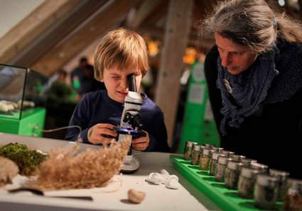 Im Mittelpunkt der Einblicketagung stand jedoch das Thema „Hands-On“ und die neu konzeptionierte Kinder- und Familienausstellung „Wald-Land-Fluss“, bei der die Museumspädagogik von Anfang an mit einbezogen war. Unter einem Titel wurden hier die naturkundliche und geologische Abteilung zusammengefasst. Das Zielpublikum Kinder und Familien klar im Blick, wurde bei der Realisierung auf ein farblich ansprechendes Farbkonzept, niedrige Vitrinenhöhen, zahlreiche interaktiven Stationen und vor allem kurze Texte geachtet, die jeweils mit einer prägnanten Kinderfrage eingeleitet werden. So locken zum Beispiel Fragen wie „Ist das Reh die Frau vom Hirsch“ oder „Kotzen Eulen ständig?“.