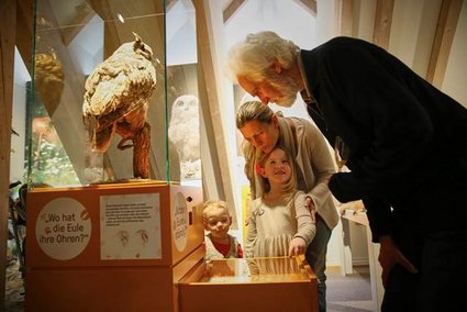 Bei einem Rundgang durch die Ausstellungsräume im Dachgeschoss des Ritterhauses erläuterten Kuratorin Anne Junk und die Leiterin der Museumspädagogik Nadine Rau die Ausstellung mit ihren offen gestalteten Dioramen und den zahlreichen Mitmach- und Hands-On-Stationen. So können z.B. am Forschertisch Naturmaterialien genau unter die Lupe genommen und duftende Kräuter erraten werden, verschiedene Hörstationen bieten auf Knopfdruck unterschiedliche Tierstimme an, ein Moosbett lädt zum Ausspannen, Zurückziehen oder Lesen ein, an mehreren Fühlstationen können verschiedene Felle oder Hölzer ertastet werden, und ein Präparatorentisch erklärt kindgerecht, wie die Tiere ins Museum gekommen sind. Zentral im Raum wurden Tische geschaffen, die für museumspädagogische Kurse genutzt werden können und für Einzelbesucher zahlreiche Spiele und Bastelmöglichkeiten parat halten. Auf einer frei schwebenden Empore unter dem Dach wurde die geologische Sammlung untergebracht. Hier leitet eine Zeitmaschine in das Thema ein. Per Knopfdruck geht es z.B. in das Zeitalter Perm oder die Steinzeit. Ein Puzzle erläutert die geologische Beschaffenheit der Ortenau, in einem Bergwerksstollen sind verschiedene Gesteine untergebracht und ein Mineralienkabinett präsentiert mit verschiedenen interaktiven Stationen seine steinerne Schätze. Auch in diesem Ausstellungsbereich werden die einzelnen Themenbereiche durch Kinderfragen eingeleitet – da es in einem Stollen jedoch doch recht dunkel ist, erläutert ein Audioguide die Antworten.