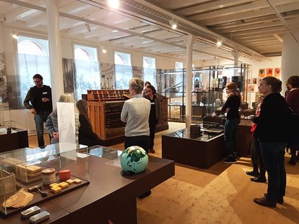 Im ersten Obergeschoss widmet sich ein großzügiger und lichtdurchfluteter Raum Lahrs gol-denem Zeitalter der Industrialisierung. Verschiedene „Werkbänke“ sind den Themen „Tabak und Zichorie““, „Schächtele“, „Druckerei“, „Zeitungswesen“ und „Familie Nestler“ zugeordnet. Gut durchdachte, digitale Mitmachstationen animieren zum Ausprobieren verschiedener Schächtele oder dem digitalen Setzen mit beweglichen Lettern. Silke Höllmüller verblüffte die Teilnehmer*innen mit der Information, dass fast alle Ausstellungsstücke im Zuge der Neuge-staltung erst von Lahrer*innen dem Museum geschenkt wurden. In einem zweiten Raum wird das Thema Militär in Lahr dargestellt. Lahr war gut 100 Jahre lang Garnisonsstadt, Mitte der 1990er zog mit den Kanadiern die letzte Garnison aus Lahr ab